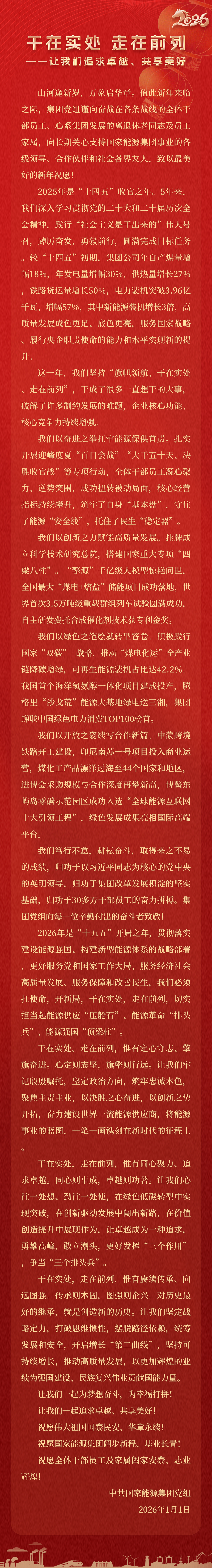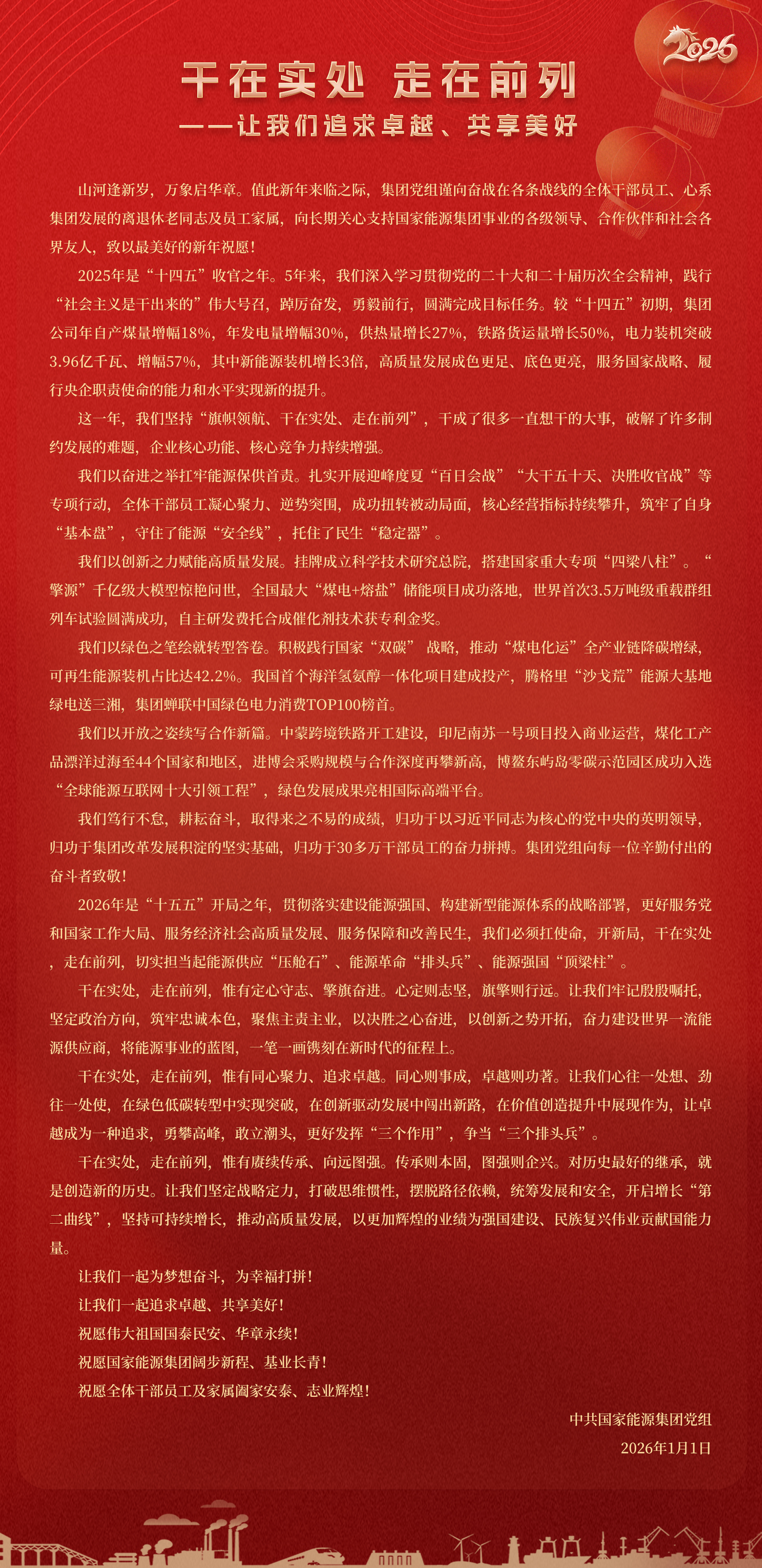 國家能源集團(tuán)胸懷“國之大者”,增產(chǎn)增供、穩(wěn)價(jià)穩(wěn)市,積極服從服務(wù)國家戰(zhàn)略、保障國家能源安全、助力國民經(jīng)濟(jì)穩(wěn)增長,推動(dòng)煤炭安全綠色智能、煤電清潔高效穩(wěn)定、現(xiàn)代煤化工高端多元低碳、運(yùn)輸物流協(xié)同一體、新能源多元?jiǎng)?chuàng)新規(guī)?;l(fā)展,全力擔(dān)當(dāng)能源強(qiáng)國頂梁柱,能源供應(yīng)壓艙石,能源革命排頭兵。